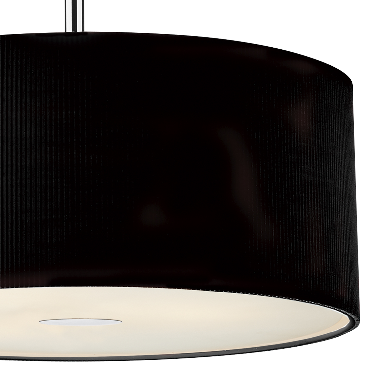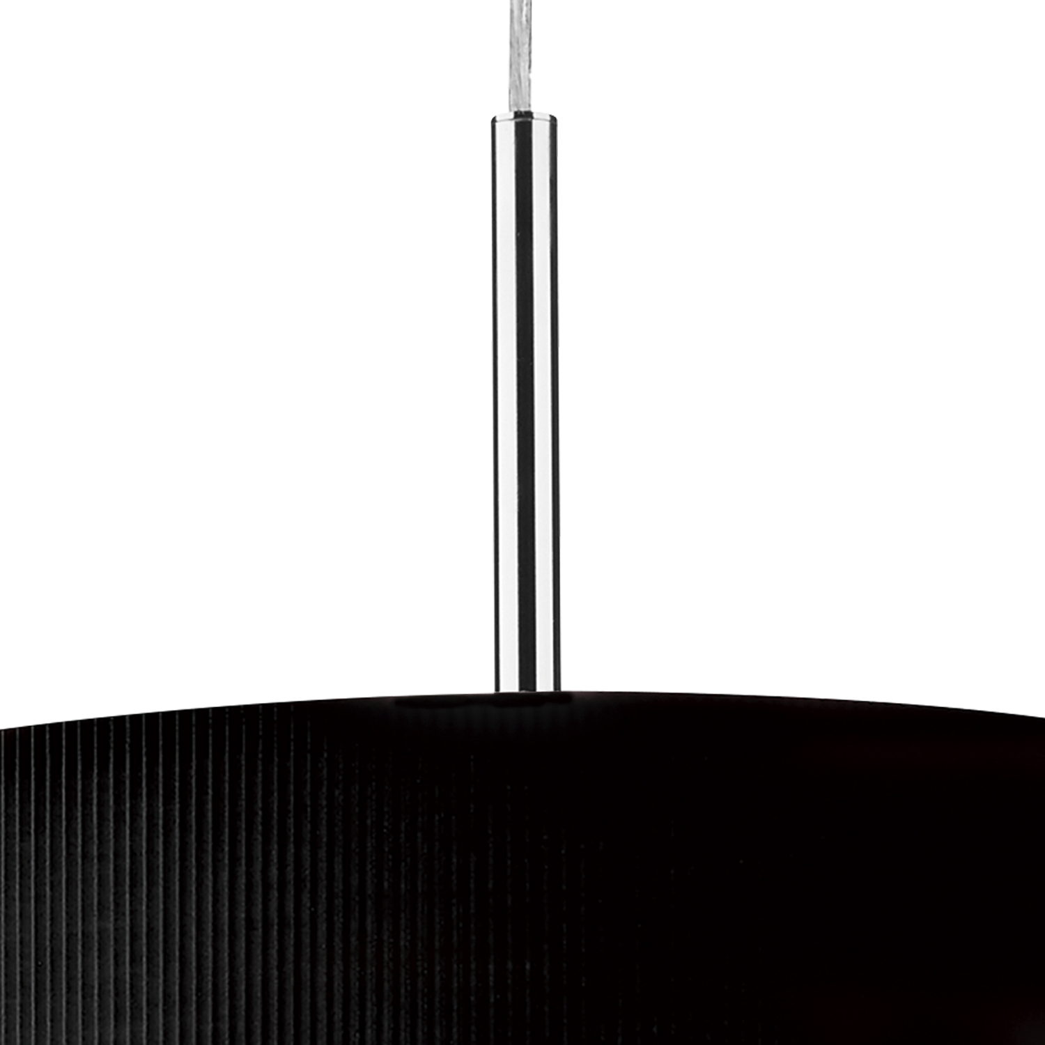 This Zaragoza pendant has a chrome ceiling plate and slender wire suspension, completed by a micro pleat black shade. The fitting also features a tempered glass diffuser which softens the light. The pendant is suitable for a range of ceiling heights. 250cm of cable is supplied with the fitting and can be height adjusted at the point of installation.